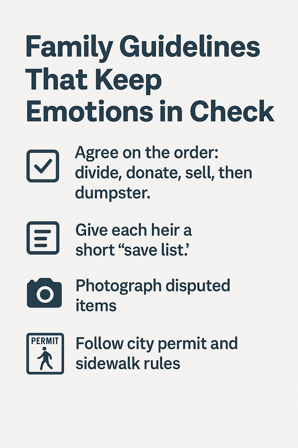 Start by gathering immediate family or heirs to identify high-value and sentimental pieces. Use labeled boxes to keep track of where each item goes. A short photo log can help resolve disagreements later, which keeps the cleanup from slowing down. Items that have clear owners should be marked first to avoid disputes.